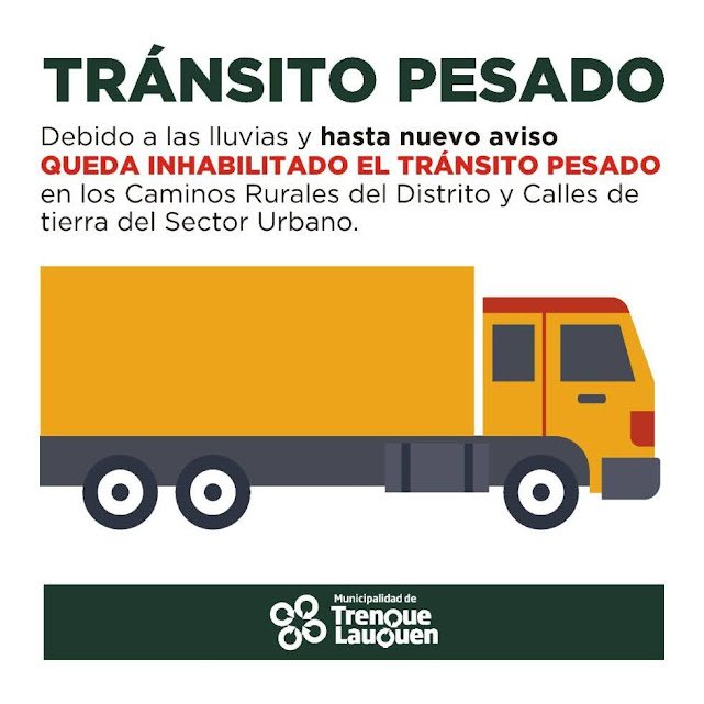 Como consecuencia de las lluvias de las últimas horas, desde hoy (miércoles) y hasta nuevo aviso quedan inhabilitados al Tránsito Pesado los caminos rurales, comprendiendo la medida a los XVI cuarteles, y los caminos de tierra urbanos de todo el distrito, informaron las direcciones de Caminos Rurales y de Conservación de Caminos Urbanos del Municipio.