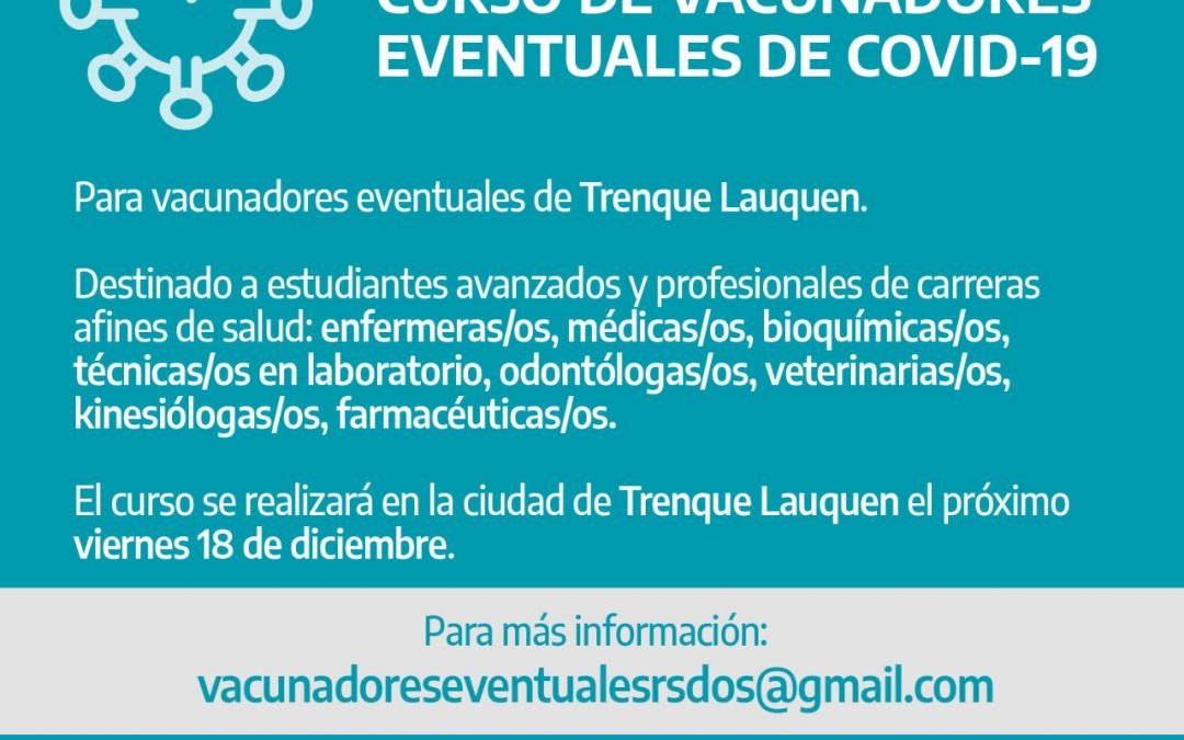 Pasado mañana (viernes 18) tendrá lugar en nuestra ciudad el curso de vacunadores eventuales de Covid-19 que organizan Región Sanitaria II, dependiente del ministerio de Salud de la provincia de Buenos Aires, y la municipalidad de Trenque Lauquen. La capacitación se...