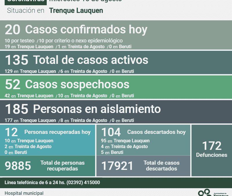 Informe de la situación en el distrito de Trenque Lauquen y en el país por la pandemia de Coronavirus. En Trenque Lauquen Los casos activos de Covid-19 en el distrito son 135, después de que se confirmaran 20 nuevos casos, 12 personas recuperadas más y...