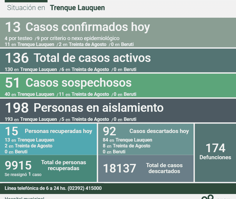 Informe de la situación en el distrito de Trenque Lauquen y en el país por la pandemia de Coronavirus. En Trenque Lauquen Trece (13) nuevos casos confirmados de Covid-19, dos (2) decesos, otras 15 personas recuperadas y 92 casos descartados fueron...