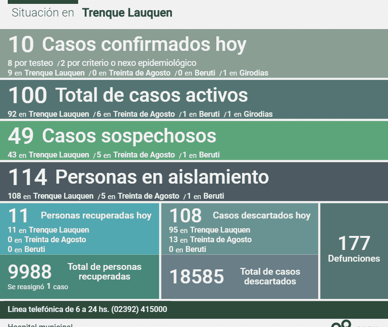 Informe de la situación en el distrito de Trenque Lauquen y en el país por la pandemia de Coronavirus. En Trenque Lauquen Nueve (9) nuevos casos confirmados de Covid-19, tres (3) decesos, otras 13 personas recuperadas y 107 casos descartados fueron...