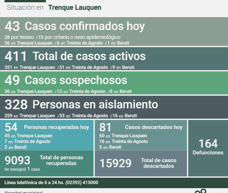 Informe de la situación en el distrito de Trenque Lauquen y en el país por la pandemia de Coronavirus. En Trenque Lauquen Cuarenta y tres (43) nuevos casos de Covid-19 confirmados, 54 personas más recuperadas y 81 casos descartados fueron reportados esta mañana...