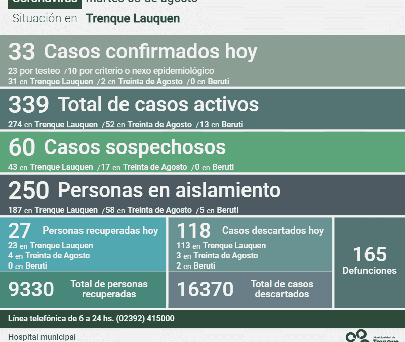 Informe de la situación en el distrito de Trenque Lauquen y en el país por la pandemia de Coronavirus. En Trenque Lauquen La subsecretaría de Salud municipal informó esta mañana (martes) 33 nuevos casos de Covid-19 confirmados, 27 personas más...