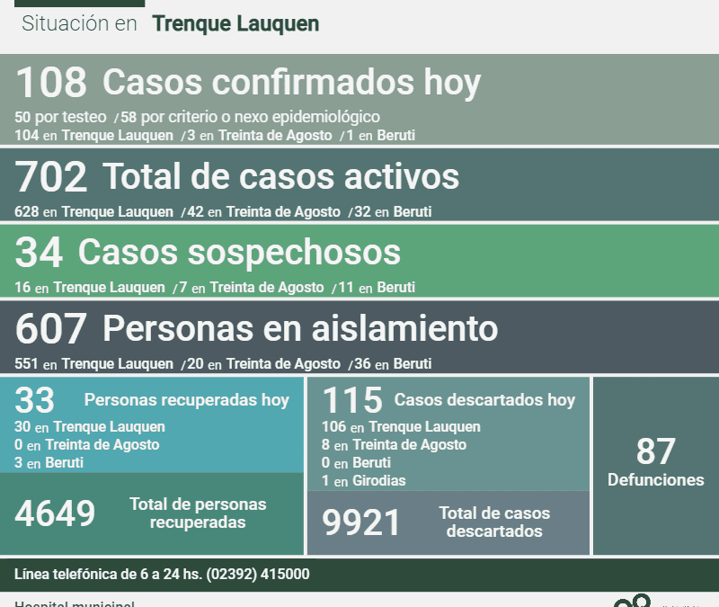 Informe de la situación en el distrito de Trenque Lauquen y en el país por la pandemia de Coronavirus. En Trenque Lauquen La subsecretaría de Salud municipal reportó esta mañana (miércoles) 702 casos activos de Covid-19 luego de confirmarse 108 nuevos casos,...