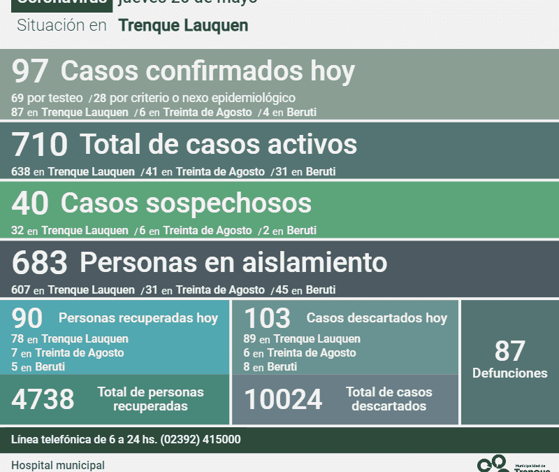 Informe de la situación en el distrito de Trenque Lauquen y en el país por la pandemia de Coronavirus. En Trenque Lauquen El número de casos activos de Covid-19 en el distrito es 710 como consecuencia de la confirmación de 97 nuevos casos y la...