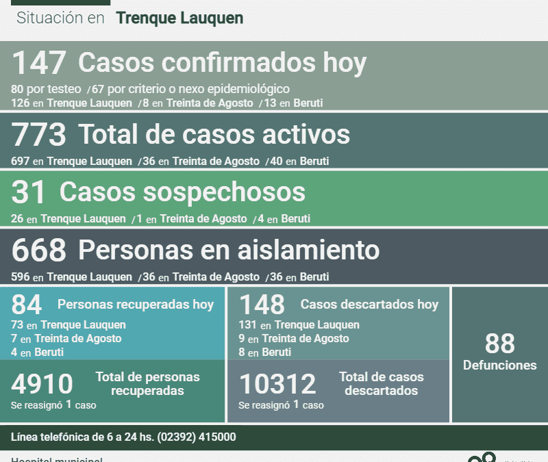 Informe de la situación en el distrito de Trenque Lauquen y en el país por la pandemia de Coronavirus. En Trenque Lauquen La subsecretaría de Salud municipal informó hoy (sábado) que el número de casos activos de Covid-19 en el distrito es 773 como...