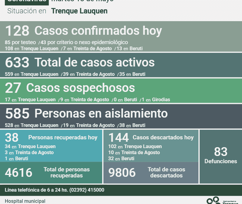 Informe de la situación en el distrito de Trenque Lauquen y en el país por la pandemia de Coronavirus. En Trenque Lauquen El número de casos activos de Covid-19 en el distrito es 633 como consecuencia de haberse confirmado 128 nuevos casos, tres (3)...