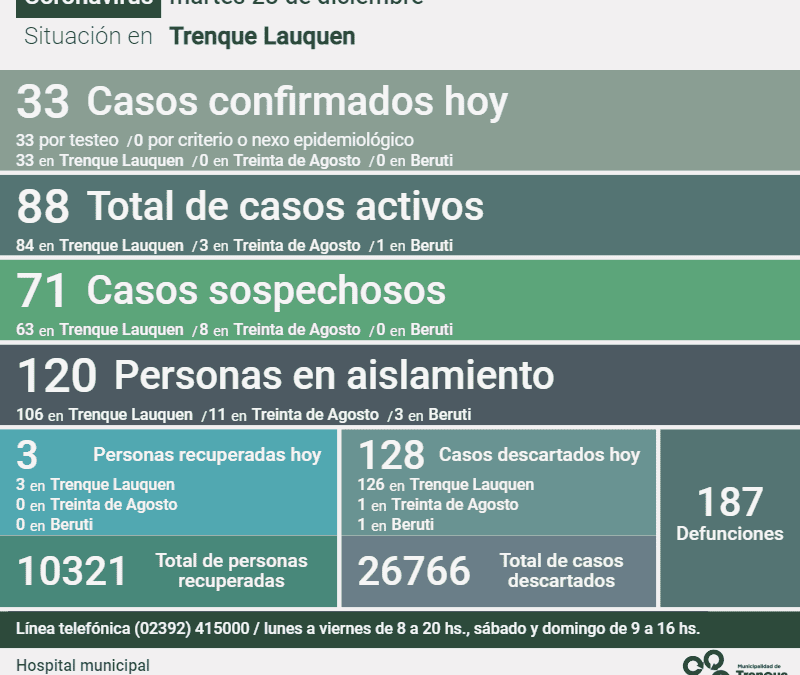 La subsecretaría de Salud municipal informó esta mañana (martes) que suman 88 los casos activos de Covid-19 en el distrito después de que en las últimas 24 horas se confirmaran 33 nuevos casos, 128 fueran descartados y otras tres (3) personas recibieran el alta,...