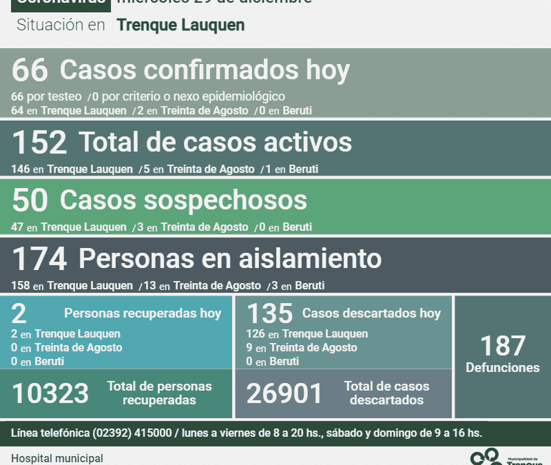Sesenta y seis (66) nuevos casos confirmados de Covid-19 en el distrito, dos (2) personas más recuperadas,135 casos descartados, 174 personas en aislamiento y 50 casos sospechosos fueron reportados esta mañana (miércoles) por la subsecretaría de Salud municipal que, a...