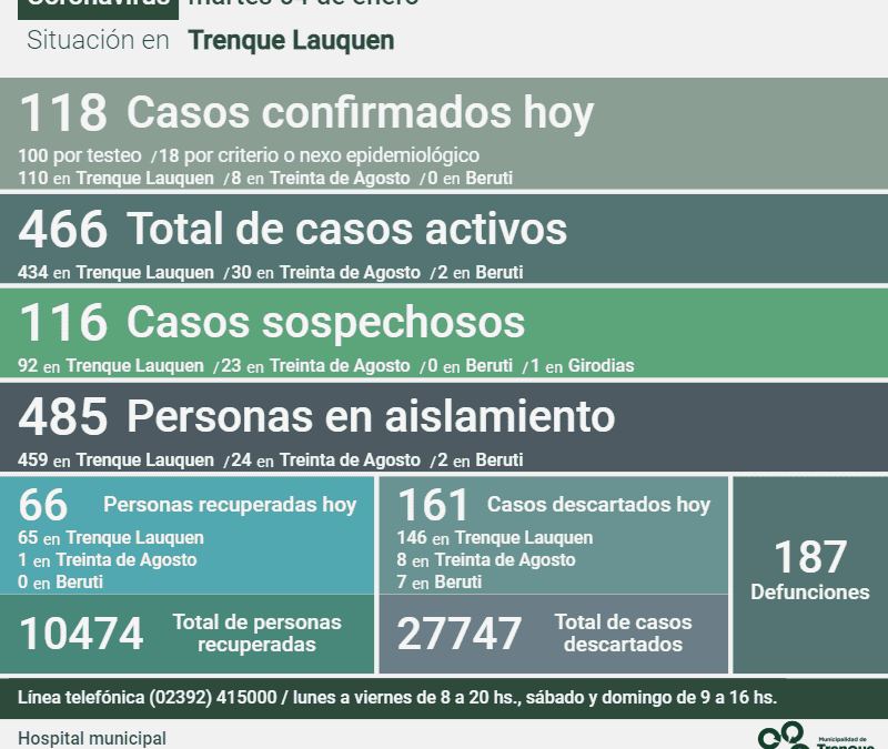 Con 118 nuevos casos de Covid-19 confirmados, otras 66 personas recuperadas y 161 casos más descartados en las últimas 24 horas, los casos activos en el distrito hoy son 466, informó esta mañana (martes) la subsecretaría de Salud municipal, que además reportó 485...