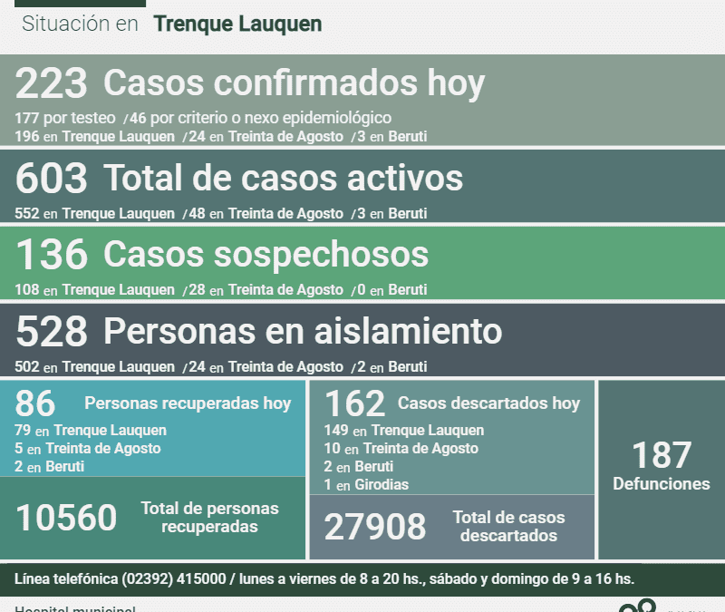 La subsecretaría de Salud municipal informó esta mañana (miércoles) que son 603 los casos activos de Covid-19 en el distrito después de que en las últimas 24 horas se confirmaran 223 nuevos casos, 162 fueran descartados y se recuperaran otras 86 personas, quedando,...