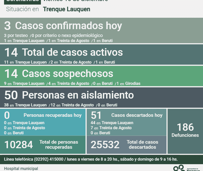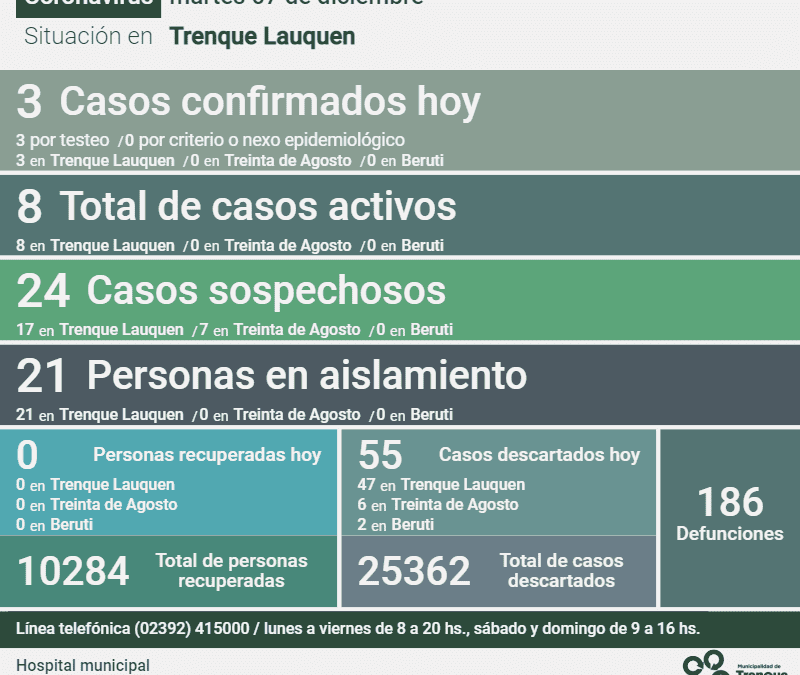 La subsecretaría de Salud municipal reportó esta mañana (viernes) tres (3) casos confirmados de Covid-19 en el distrito -uno (1) de Trenque Lauquen, uno (1) de Treinta de Agosto y otro de Beruti, todos detectados por hisopado-; 51 casos descartados y 50 personas en...