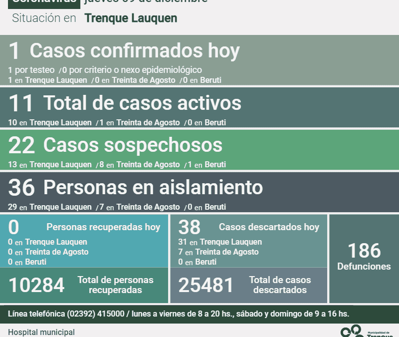 La subsecretaría de Salud municipal reportó esta mañana (jueves) un (1) nuevo caso confirmado de Covid-19 en el distrito, 38 casos descartados, 22 casos sospechosos y 36 personas en aislamiento. El nuevo caso positivo fue diagnosticado por hisopado y corresponde a...