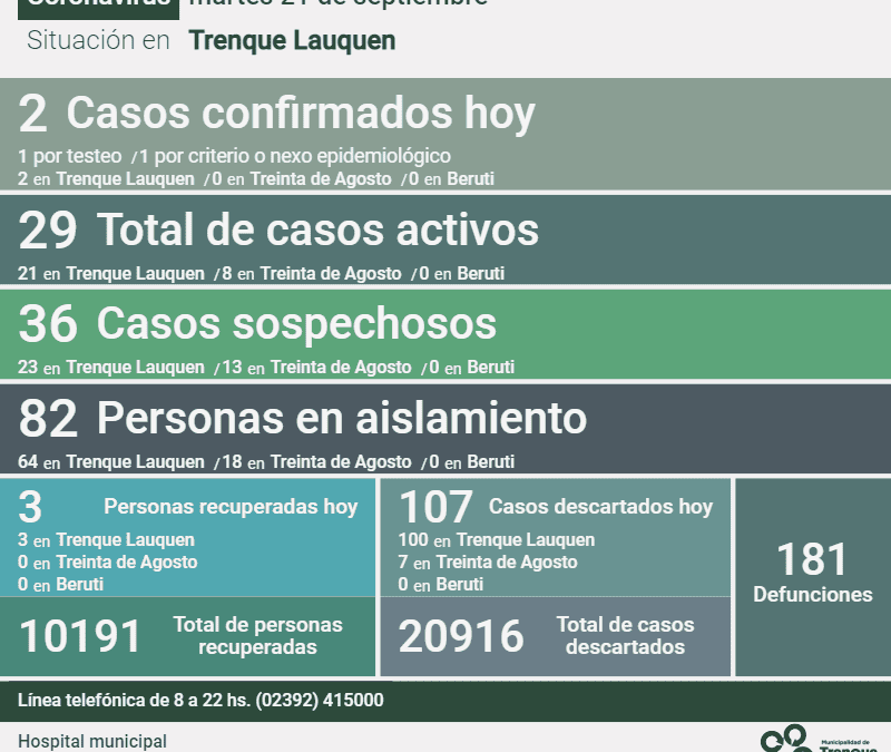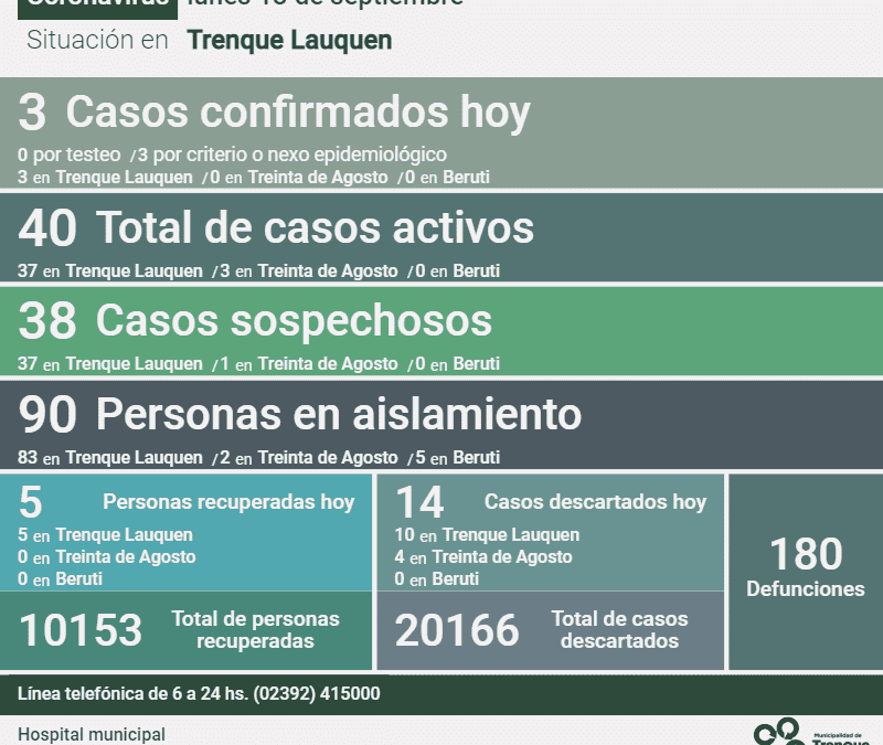 Informe de la situación en el distrito de Trenque Lauquen y en el país por la pandemia de Coronavirus. En Trenque Lauquen Tres (3) nuevos casos confirmados de Covid-19 -todos detectados por criterio o nexo epidemiológico-, cinco (5) personas recuperadas...