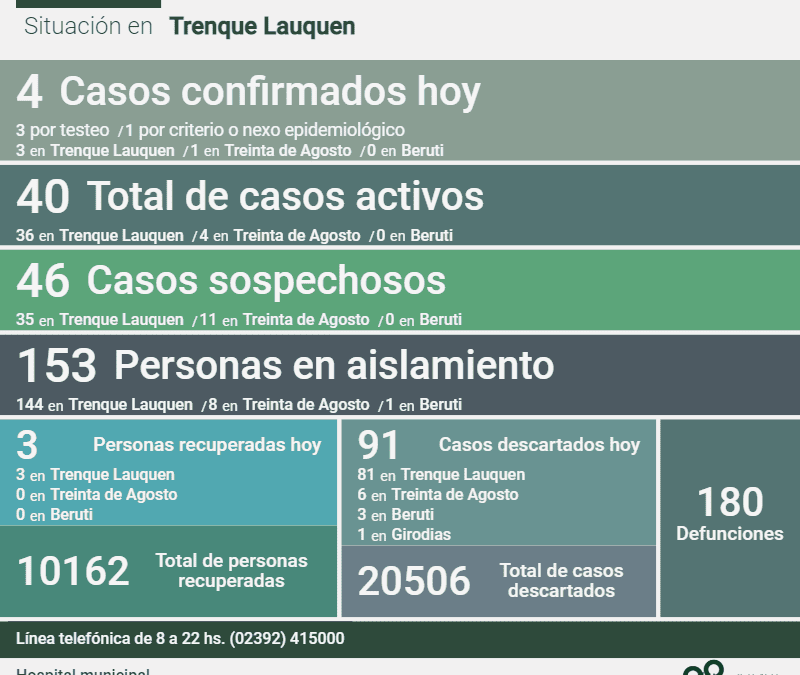 Informe de la situación en el distrito de Trenque Lauquen y en el país por la pandemia de Coronavirus. En Trenque Lauquen Cuatro (4) nuevos casos confirmados de Covid-19, tres (3) personas recuperadas más y 91 casos descartados fueron reportados esta...