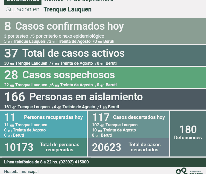 Informe de la situación en el distrito de Trenque Lauquen y en el país por la pandemia de Coronavirus. • En Trenque Lauquen El número de casos activos de Covid-19 en el distrito se mantiene en 37, tras haberse registrado en las últimas 24 horas la misma cantidad de...