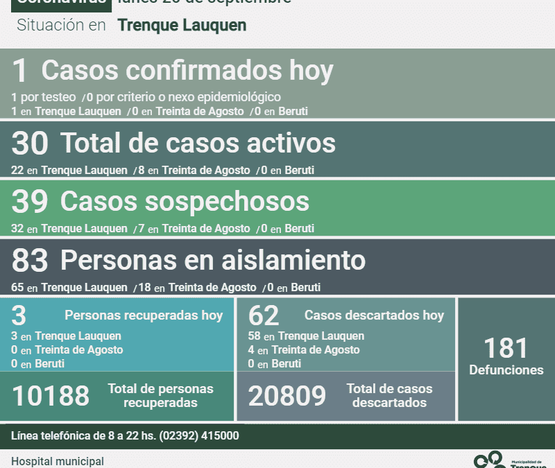 Informe de la situación en el distrito de Trenque Lauquen y en el país por la pandemia de Coronavirus. En Trenque Lauquen Un (1) nuevo caso confirmado de Covid-19, un (1) deceso, tres (3) personas recuperadas más y 62 casos descartados fueron reportados...