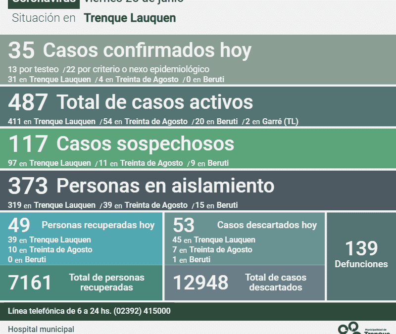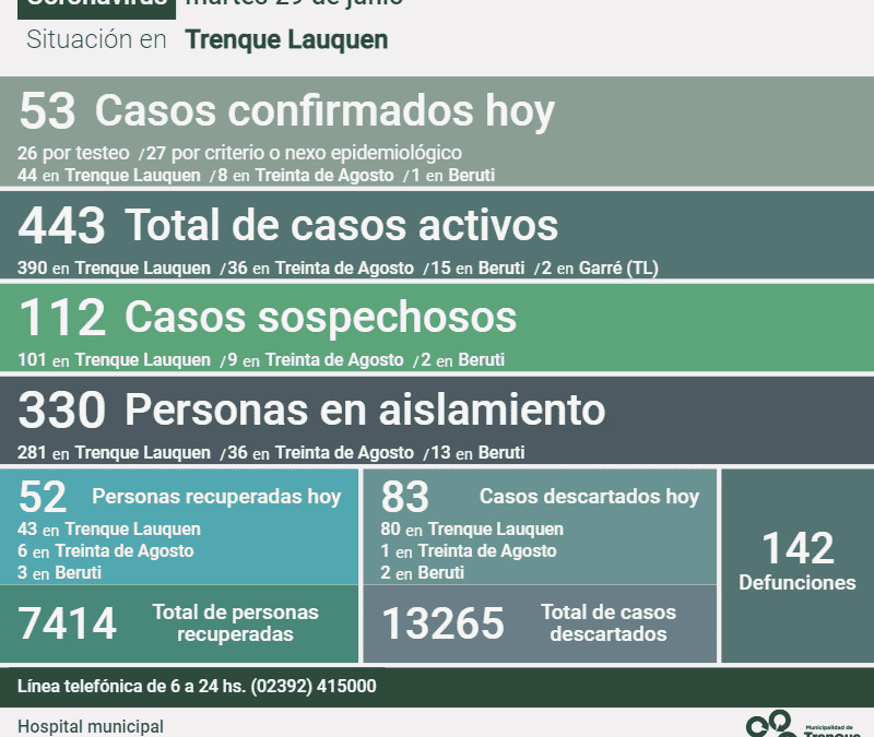 Informe de la situación en el distrito de Trenque Lauquen y en el país por la pandemia de Coronavirus. En Trenque Lauquen Los casos activos de Covid-19 en todo el distrito se mantienen sin cambios respecto de ayer (lunes) y siguen siendo 443 después de...