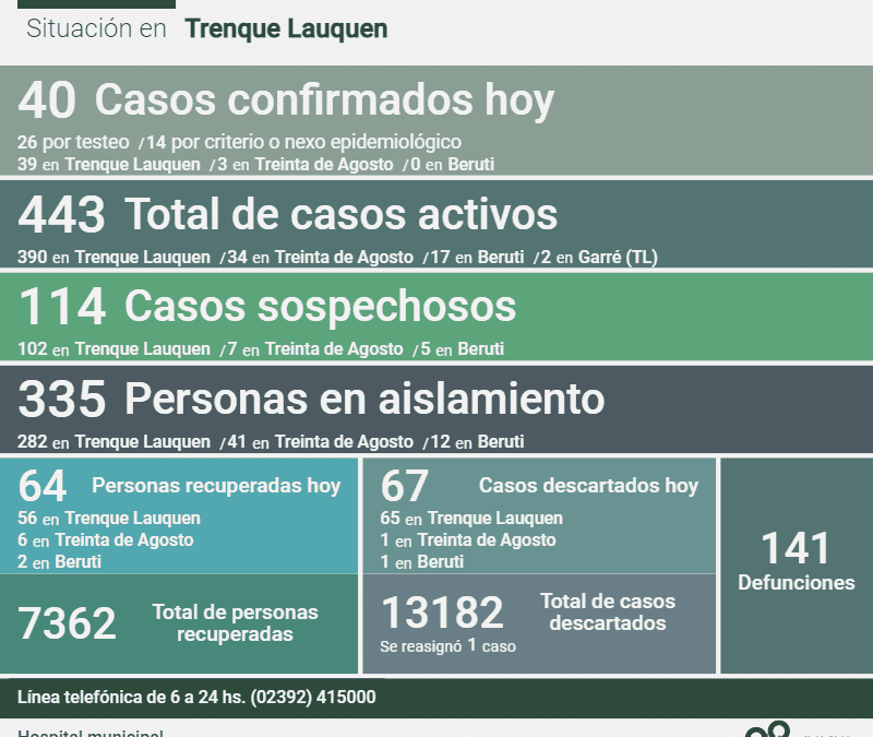 Informe de la situación en el distrito de Trenque Lauquen y en el país por la pandemia de Coronavirus. En Trenque Lauquen Cuarenta (40) nuevos casos confirmados de Covid-19, dos (2) decesos, 64 personas más recuperadas, 67 casos descartados, 114 casos...