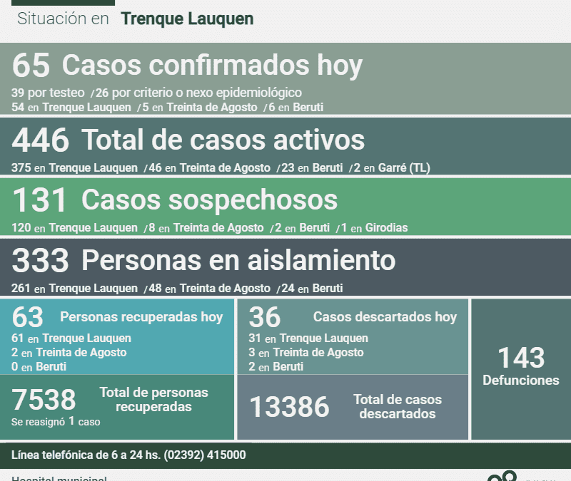 Informe de la situación en el distrito de Trenque Lauquen y en el país por la pandemia de Coronavirus. En Trenque Lauquen Sesenta y cinco (65) nuevos casos confirmados de Covid-19 en el distrito, 63 personas recuperadas y 36 casos descartados, fueron...