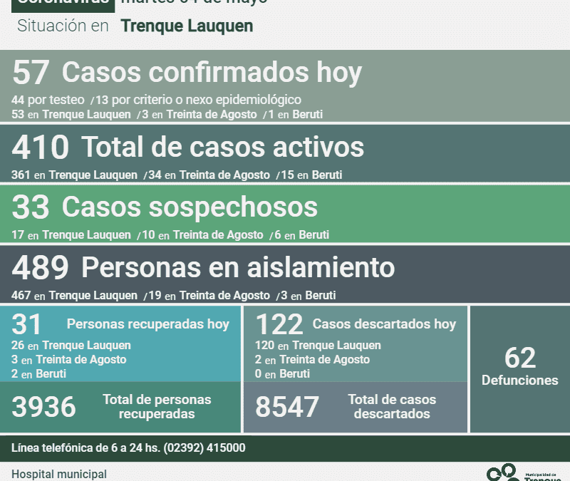 Informe de la situación en el distrito de Trenque Lauquen y en el país por la pandemia de Coronavirus. En Trenque Lauquen La subsecretaría de Salud informó esta mañana (martes) que los casos activos de Covid-19 en el distrito son 410, después de...