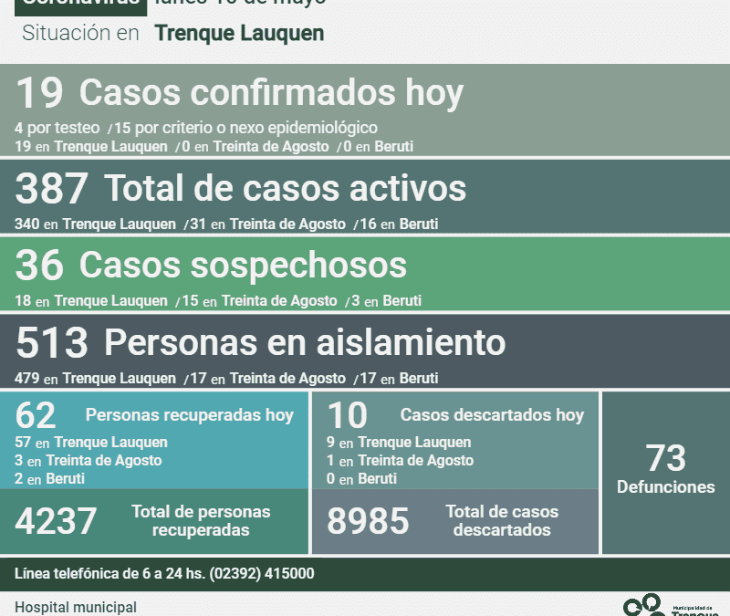 Informe de la situación en el distrito de Trenque Lauquen y en el país por la pandemia de Coronavirus. En Trenque Lauquen Diecinueve (19) nuevos casos positivos, tres (3) decesos, 62 personas recuperadas y diez (10) casos descartados fueron reportados...