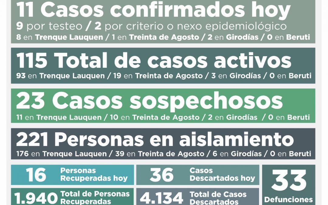 Informe de la situación en el distrito de Trenque Lauquen y en el país por la pandemia de Coronavirus. . En Trenque Lauquen La subsecretaría de Salud reportó esta mañana (sábado) la confirmación de 11 nuevos casos de Covid-19 –nueve (9) por testeo y dos (2) por nexo o...