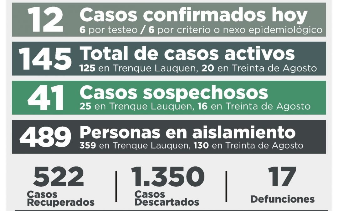 Informe de la situación en el distrito de Trenque Lauquen y en el país por la pandemia de Coronavirus. En Trenque Lauquen Una persona fallecida, 12 nuevos casos de Covid-19 confirmados –seis (6) por testeo y seis (6) por nexo epidemiológico, según...