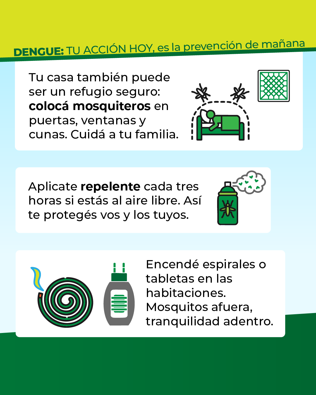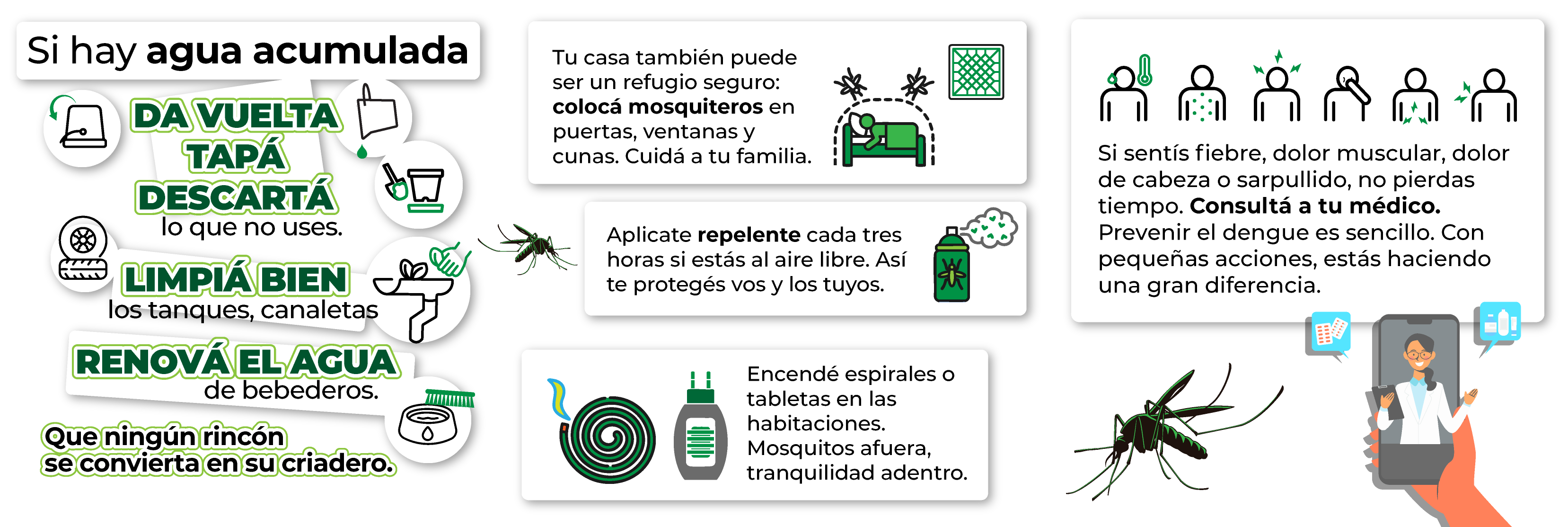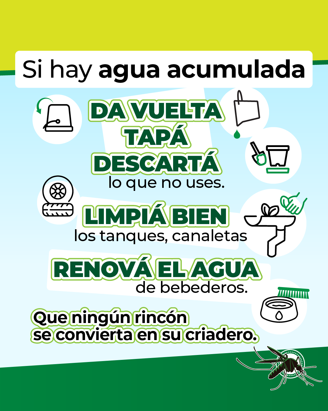 • Eliminá el agua acumulada: Revisá patios, jardines y canaletas; asegurate de que no haya recipientes que puedan acumular agua.