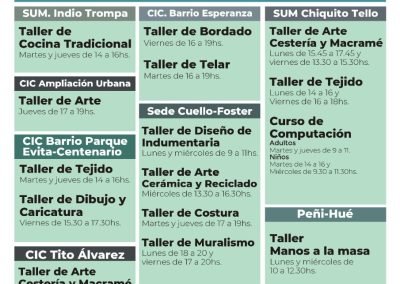Los interesados pueden inscribirse en la Escuela Municipal, ubicada en el primer piso del Centro Cívico “La Primera”, en los centros de referencia y los lugares donde se desarrollan los cursos.