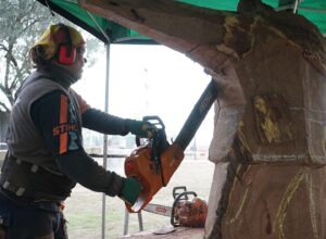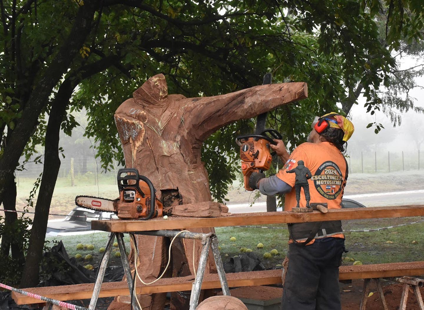 Kucharczuk toma esta pieza y realiza un tallado que evoca la figura de un joven soldado, quien señala al sur con firmeza y determinación, exactamente en dirección a la ubicación geográfica de las Islas Malvinas. Esta imagen poderosa no solo rinde homenaje a quienes han defendido nuestra tierra, sino que también encarna el espíritu de coraje y esperanza que siempre debemos preservar.