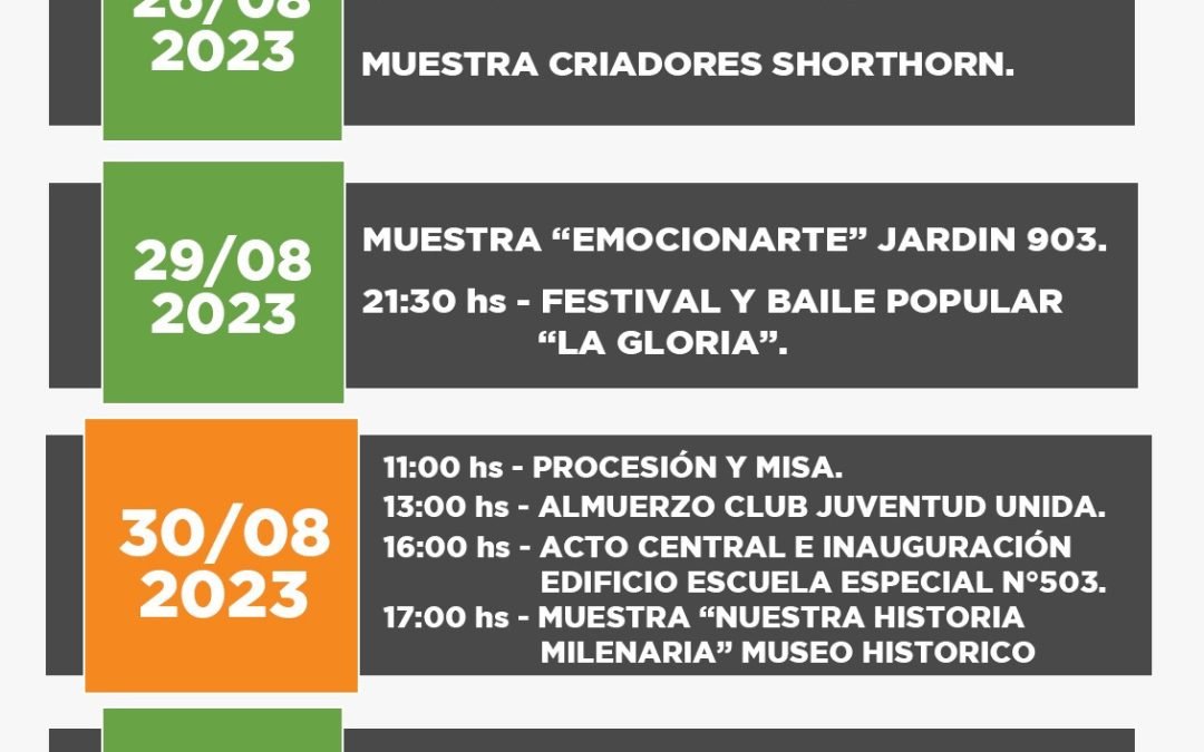 La agenda de actividades comenzará el sábado 26 con una muestra de Criadores Shorthorn, que quedará inaugurada a las 10 en el Museo Histórico, y continuará el 29 de agosto con la apertura de la muestra “Emocionarte”. en el Jardín nº 903. y por la noche, a partir de las 21.30 y en el Club La Gloria, con un Festival y Baile popular, de entrada libre y gratuita. En esta oportunidad se presentarán los artistas Marichi García, Ñaupa Folclore, Danza Municipal y OrellanaLucca.