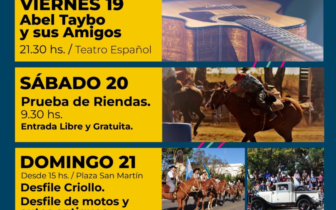 Además, comentó que “el domingo se realizará el desfile criollo, de autos y motos antiguas; los caballos y jinetes salen desde el predio de Macaya y Mirabelli, continúan por calle Tala hasta Wilde-Villegas donde se sumarán las motos y los autos antiguos, de manera que a las 15.30 frente al Palacio Municipal estará todo preparado para disfrutar del paso de los autos, las motos y las agrupaciones”.