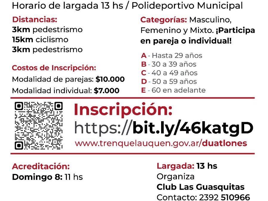 El domingo 8 de septiembre se disputará la 2º fecha del 1º Campeonato de Duatlones –Ciclismo y Pedestrismo- organizado por la dirección de Deporte municipal, los clubes Barrio Alegre, Las Guasquitas y Progreso y el Instituto Superior de Formación Docente nº 144.