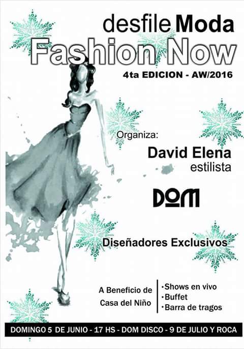 DOM (9 de Julio y Roca) David Elena realizará el desfile de modas “Fashion Now”, cuarta edición, a beneficio de Casa del Niño con la presencia de personalidades reconocidas en ese ámbito. Del encuentro participarán diseñadores locales, habrá show en vivo (baile), barra de tragos y buffet. Entre las personas que estarán presentes se encuentra una modelo de Ana Pugliese y la Modelo Internacional Miss Panamá, Luisina Sendra. Las entradas tienen un costo de 100 pesos y se pueden obtener en Casa del Niño, Buin y perfumería Red.