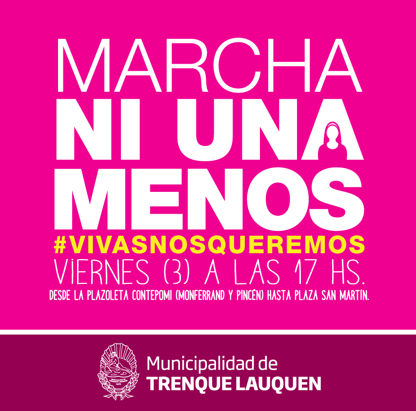 Familia, invita a toda la comunidad a participar de la Marcha “#NiUnaMenos” que se llevará a cabo el próximo viernes (3) a las17 hs. desde la plazoleta Contepomi (Monferrand y Pincén) hasta la Plaza San Martín. En esta oportunidad, la marcha incorpora una nueva consigna #Vivasnosqueremos, que visibiliza diferentes tipos de violencia contra la mujer. La marcha, de carácter nacional, es impulsada por diferentes organizaciones civiles que luchan contra los