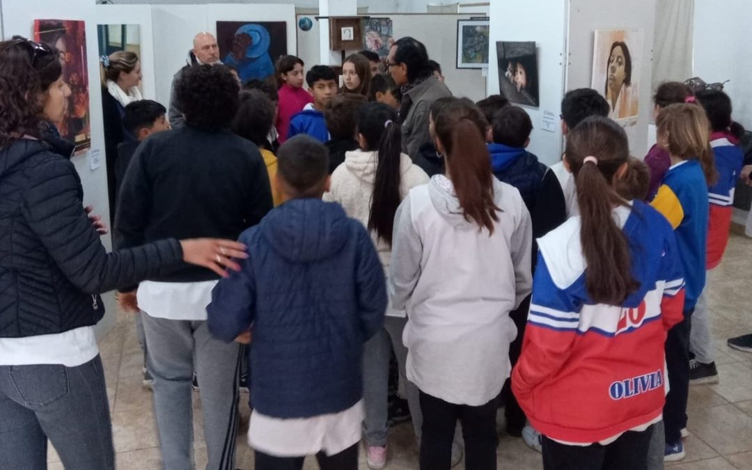 Los chicos/as, acompañados por docentes de la institución, recorrieron la exposición y también pudieron dialogar con los muralistas que tendrán a cargo la intervención de las paredes de instituciones y distintos espacios de la localidad.