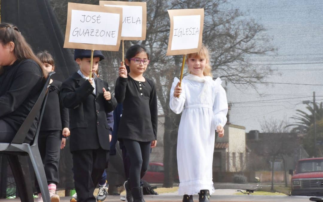 En la representación y el relato desfilaron la llegada del padre José Castellaro; la fábrica Giat y BAT; la fundación de instituciones deportivas, como el Club Giat y La Luisa; el arribo del padre José Aldobrando Ciucarelli (tras la muerte del padre Castellaro); la fundación del Instituto Agrotécnico; la creación del Jardín n° 904 Dr. Jorge Simini, el éxito deportivo de Giat, campeón en fútbol en 1964; la Peña 20 de Junio; el ciclismo con un presente que lo hace reverdecer; los dos cines que supieron tener; el flagelo de las inundaciones; el folclore, el teatro y el coro Tallil Che. Y también un hecho singular que atrapó la curiosidad de los chicos: el circo que tenía la atracción de un oso que peleaba con aquel espectador que se animara a enfrentarlo. Un cerrado y prolongado aplauso ñpremiò la dedicación y compromiso de alumnos y docentes.
