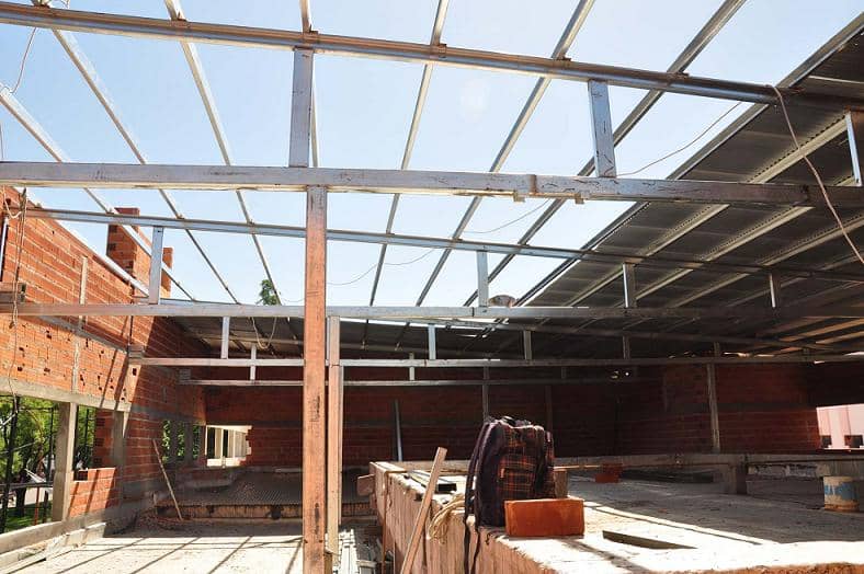 En estos días se están completando los trabajos de cubierta de techo del sector, sobre un total de 840 metros cuadrados cubiertos. Se trabajó con chapas sobre estructuras de hierro metálicas.