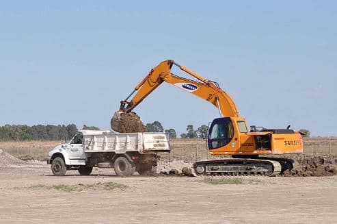 En el lugar trabaja la Rertroexcavadora Samsung y dos camiones volcadores, que se encargan de trasladar la tierra hasta las zonas que necesitan ser rellenadas.