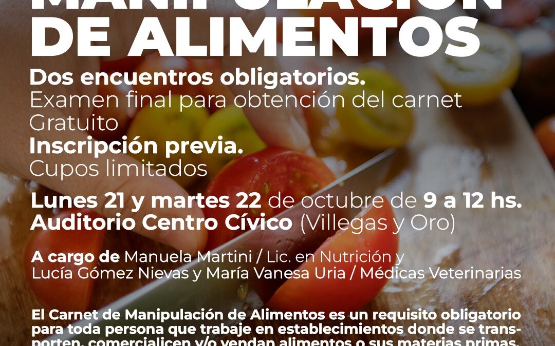 El área de Bromatología municipal informa que la semana que viene, lunes 21 y martes 22, de 9 a 12 en el auditorio del Centro Cívico (Oro y Villegas) se dictará un nuevo curso presencial y gratuito de Manipulación Segura de Alimentos.
