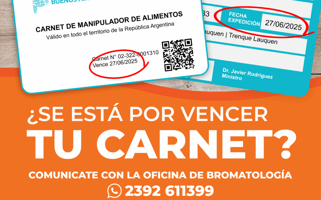 La oficina de Bromatología, que depende de la subsecretaría de Desarrollo Económico y Producción del municipio, recuerda que el carnet de Manipulación de Alimentos tiene vigencia por tres (3) años, y recomienda a aquellas personas que tengan el carnet vencido o próximo a su vencimiento comunicarse con el área para renovarlo.