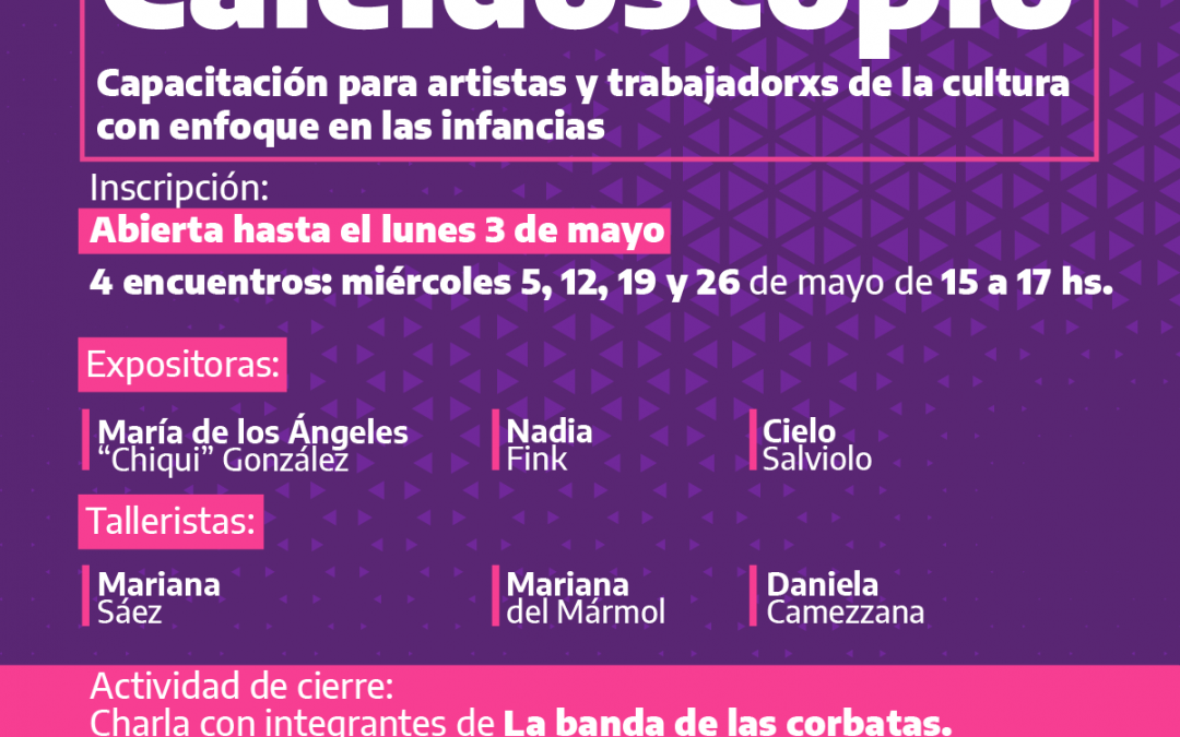 La dirección de Cultura del Municipio informa que hasta el próximo lunes (3 de mayo) está abierta la inscripción para participar de “Caleidoscopio”, una capacitación para artistas y trabajadores/as de la cultura con enfoque en las infancias que impulsa el Ministerio de Producción, Ciencia e Innovación Tecnológicade la provincia de Buenos Aires.