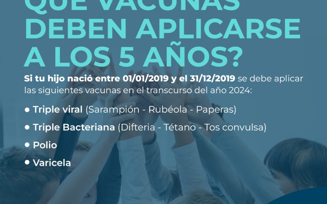 . Deberán recibir las vacunas correspondientes a los “5 años” todas las personas nacidas entre el 01/01/2019 y el 31/12/2019. Si el niño/a tiene 6 años o más y todavía no se vacunó está a tiempo de hacerlo y ponerse al día con el Calendario de Vacunación acercándose a cualquier Vacunatorio del distrito. Las vacunas son:
