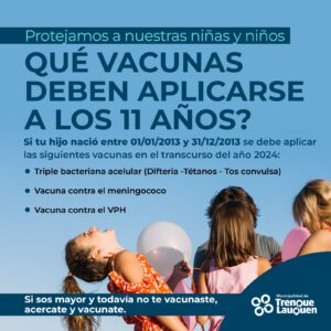 . Deberán recibir las vacunas correspondientes a los “11 años” todas las personas nacidas entre el 01/01/2013 y el 31/12/2013. En aquellos casos de niños/as que tienen más de 11 años y no se vacunaron también deberán hacerlo y ponerse al día. Las vacunas son: