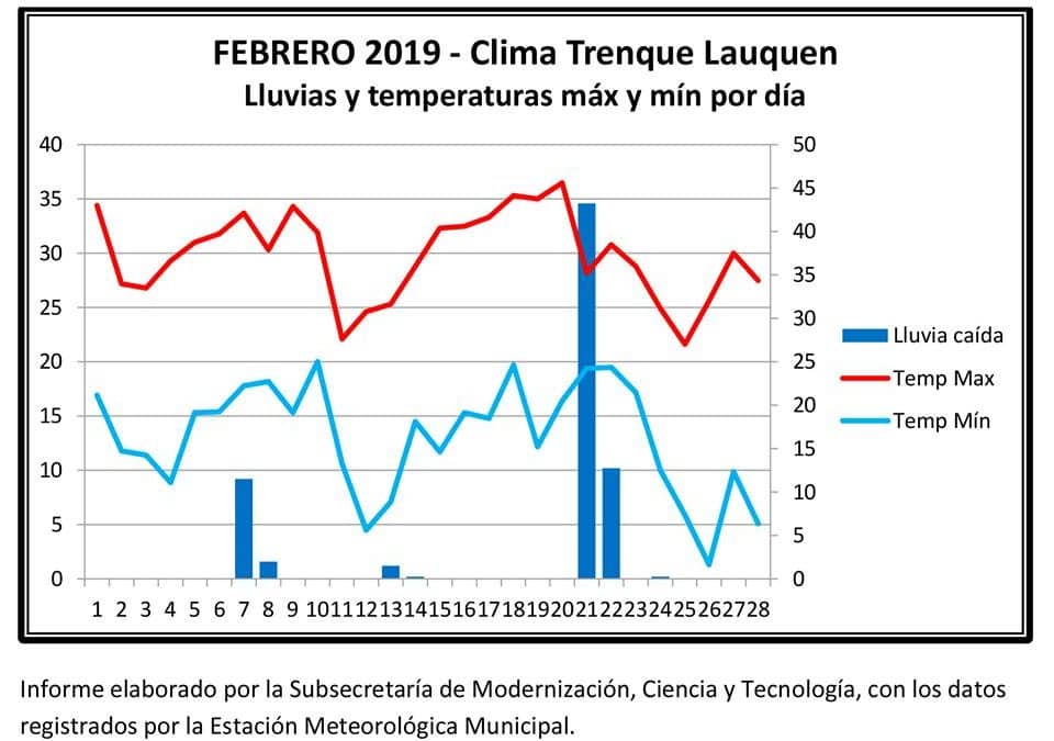La temperatura máxima en el mes de febrero ascendió a 36,50 ºC y se registró el miércoles 20 a las 17:30 hs., mientras que la mínima fue de 1,3 ºC el miércoles 6 a  las 7 hs., de acuerdo a un informe elaborado por la Subsecretaría de Modernización, Ciencia y Tecnología, con los datos registrados por la Estación Meteorológica Municipal.