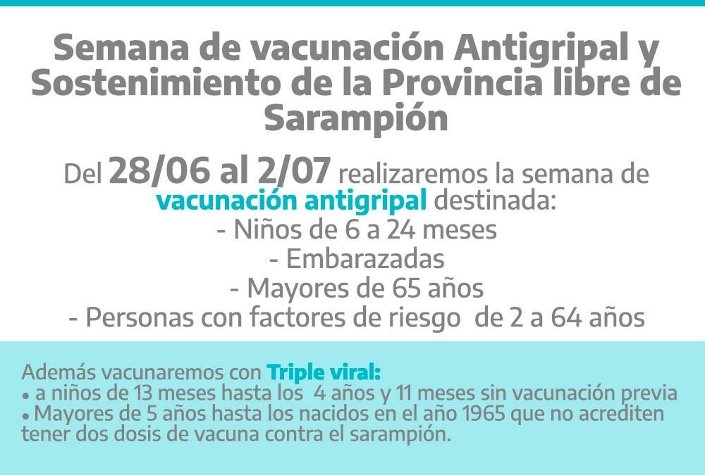 La subsecretaría de Salud municipal, a través del área de Vacunación y Región Sanitaria II, inició hoy (lunes) y seguirá hasta el próximo viernes (2 de julio) la “Semana de la Vacunación Antigripal y Sostenimiento de la Provincia Libre de Sarampión”.