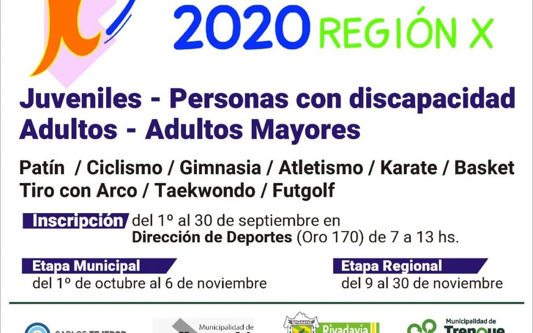 Desde el próximo martes y hasta el miércoles 30 de septiembre estará abierta la inscripción para participar de la primera edición de los “Juegos Regionales 2020 / Región X”, que organizan las direcciones de Deportes de los municipios de Florentino Ameghino, Pellegrini, Rivadavia, Salliqueló, Carlos Tejedor, Trenque Lauquen, Tres Lomas y General Villegas.