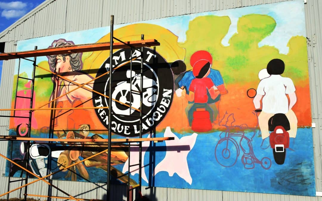 En uno de los extremos del galpón, sobresale el mural en proceso alusivo a los Amigos de las Motos Antiguas de Trenque Lauquen, del muralista local Hernán “Sechu” Martín.