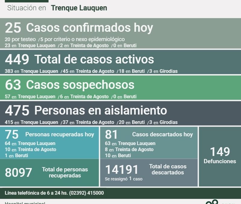 Los 25 nuevos casos positivo -20 diagnosticados por testeo y cinco(5) por criterio o nexo epidemiológico según protocolo actualizado vigente- corresponden a Trenque Lauquen, 23, y a Treinta de Agosto, dos (2), mientras que entre los 449 casos activos, 383 pertenecen a la ciudad cabecera, 45 a Treinta de Agosto, 18 a Beruti y tres (3) a Girodías: Del total, 32 están internados en el Hospital Municipal, cinco (5) se encuentran en el Centro Extrahospitalario del ex hotel Pailla Hué y 412 en sus domicilios particulares.